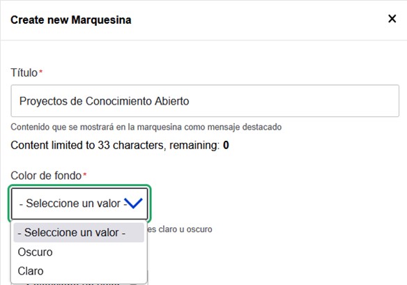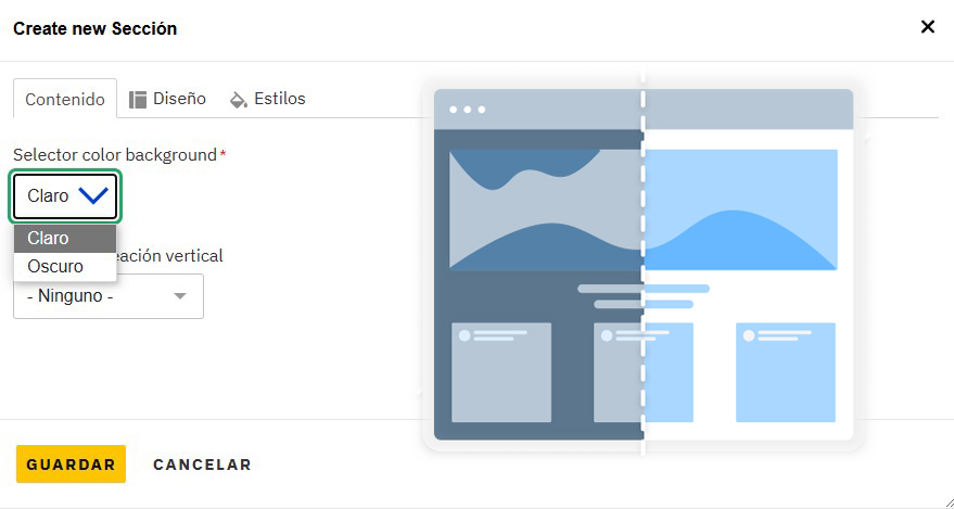 Carga de la imagen (1400x700 px) o fondo de color amarillo, claro y oscuro. Configuraciones para el enlace tipo banner interno, link y botón.