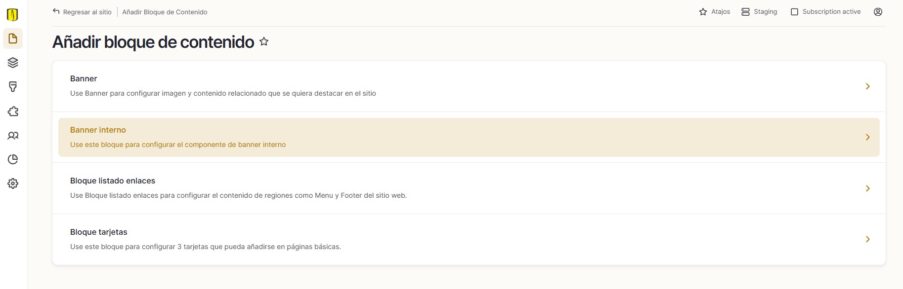 Son utilizados para crear contenidos personalizados, permitiendo ser reutilizado entre páginas desde los componentes. Existen 4 tipos de bloques banner, banner interno, bloque listado enlaces y bloque tarjetas. Para ingresar en el menú busca Contenidos > Bloques.