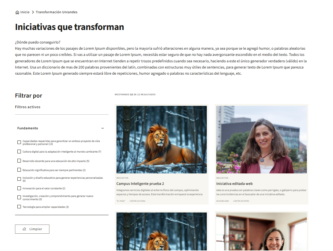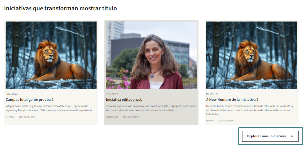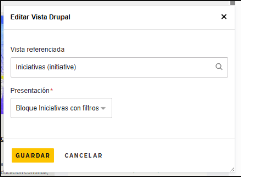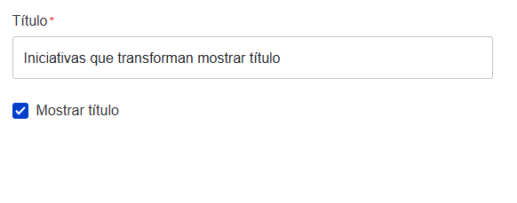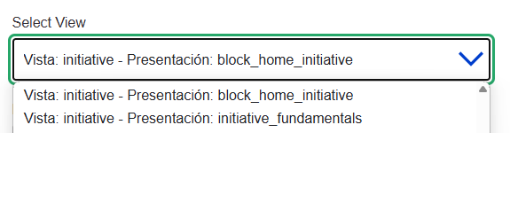 Esta opción permite configurar los filtros y resultados para la visualización en el sitio TU+ de las tarjetas de iniciativas, filtradas según los fundamentos deseados, ofreciendo así un acceso rápido y sencillo al contenido de todas las iniciativas del sitio TU+. Para configurar el componente Vista de Iniciativas, se deben seguir los siguientes pasos:
