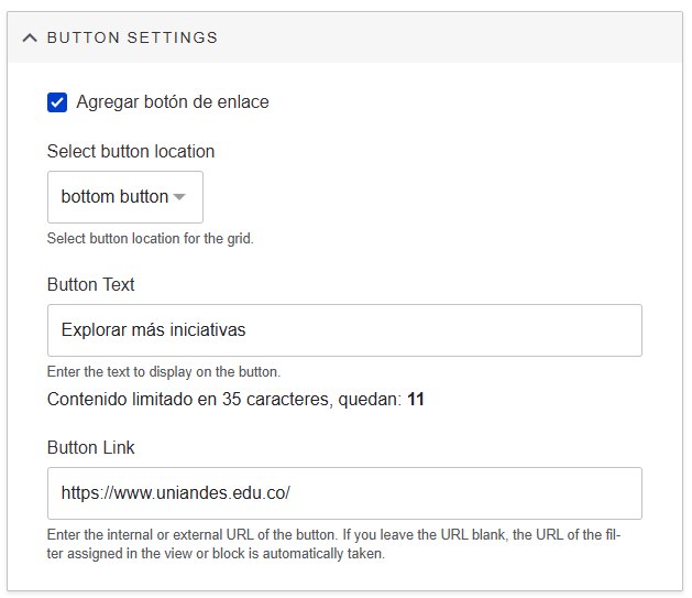 Opción de dos botones para enlace URL completa o path, texto de enlace (Hasta 35 caracteres), atributos URL _self = Misma ventana | _blank = Nueva pestaña y contenido relacionado por búsqueda.