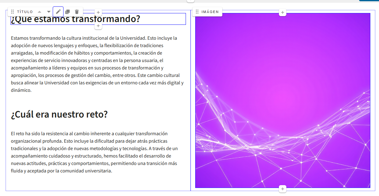 Crear y gestionar contenido es muy sencillo y flexible gracias al editor de texto abierto. Este editor te permite estructurar tu contenido de manera eficiente, siguiendo las configuraciones establecidas por la Universidad.