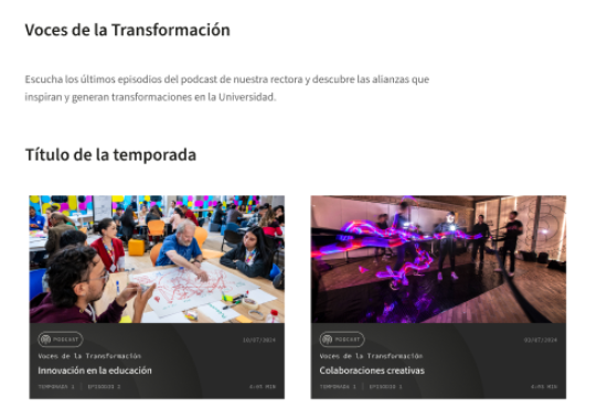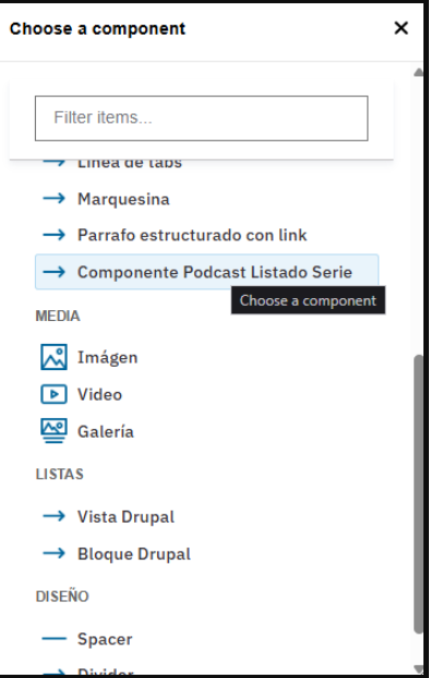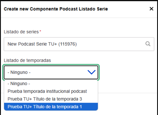 Esta opción permite configurar el componente Listado de episodios por serie para su visualización en el sitio TU+, facilitando un acceso rápido y sencillo a los episodios de una temporada relacionados con una serie. Para configurar el componente Podcast, se deben seguir los siguientes pasos: