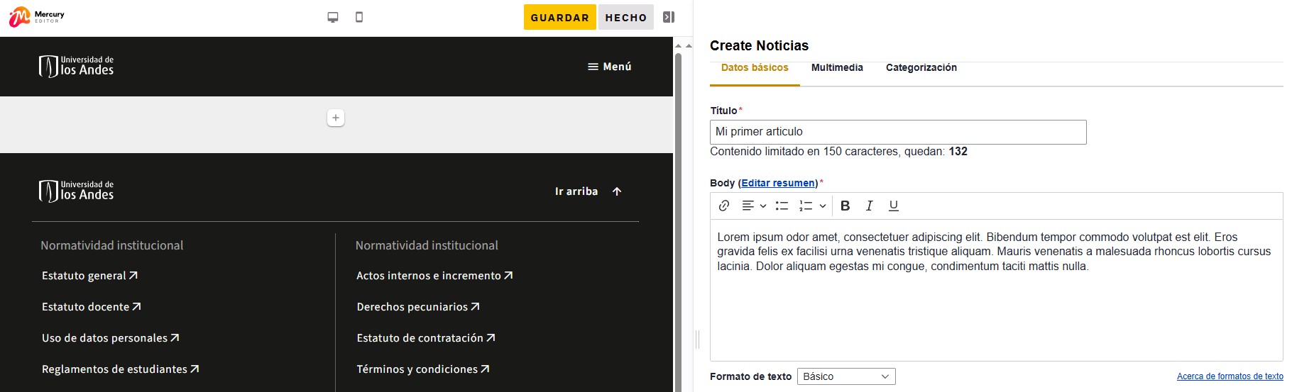 Texto descriptivo es un fragmento corto que aparecerá como resumen de la noticia, ubicado como pie del título. Opción de seleccionar lista de autores y coautores según taxonomía.