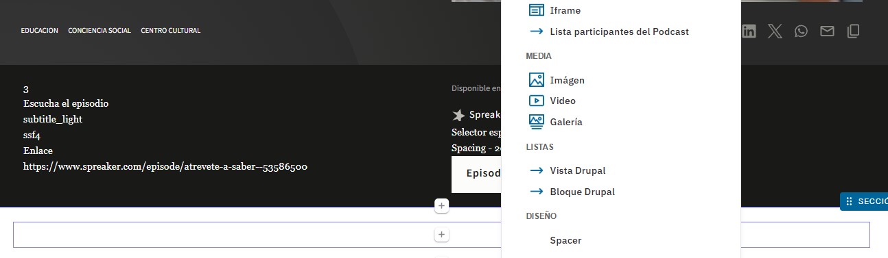 Obteniendo como resultado el encabezado de datos básicos del podcast.En esta sección, podrás agregar contenido multimedia utilizando diversos componentes. Esto te brinda la versatilidad y personalización necesarias para adaptar cada episodio, ya sea en formato de audio o video.