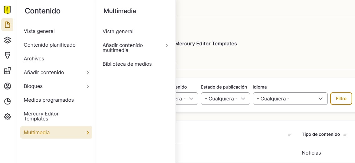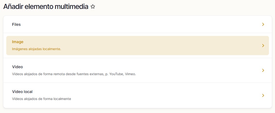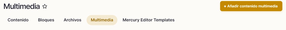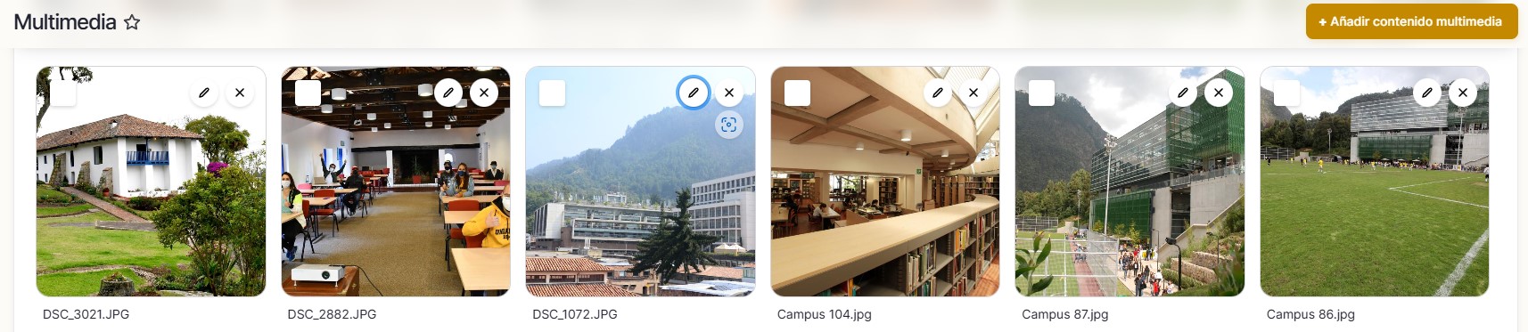 La sección multimedia es un espacio dedicado a almacenar y organizar imágenes, videos y documentos. Este repositorio no solo te permite guardar estos archivos, sino que también ofrece opciones adicionales para la gestión y presentación de estos contenidos. Ingresando Contenidos > Multimedia.