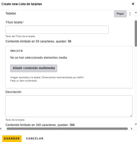 Título tarjeta: Este campo es obligatorio y se mostrará en cualquier tipo de tarjeta disponible (simple, tile, imagen). Se aceptan hasta 50 caracteres.Imagen: Este campo es opcional y se mostrará en cualquier tipo de tarjeta disponible (simple, tile, imagen). Se pueden seleccionar una imagen desde los archivos locales del computador o desde la librería del sitio.Descripción: Este campo es opcional y se mostrará en las tarjetas simple y tile. Permite añadir una descripción de máximo 360 caracteres.