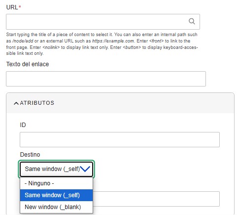 URL: Este campo permite relacionar contenido externo o interno. Para agregar contenido externo se debe copiar la URL a la cual el usuario será redirigido al dar clic en la tarjeta. Para relacionar contenido interno, se debe digitar el nombre del contenido y el sistema traerá las coincidencias para que se seleccione la correcta. Aplica para todos los tipos de tarjeta.Texto del enlace: Este campo es opcional y permite digitar el texto que acompaña la URL definida. No se visualizará en ningún tipo de tarjeta.Atributo Destino: En esta opción el usuario debe seleccionar si desea que el enlace relacionado en el campo URL, sea abierto en una nueva ventana o en la misma. Cuando se relaciona contenido externo, se debe seleccionar la opción “new window”, por el contrario, para contenido interno se debe seleccionar la opción “sabe window”.