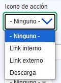 Icono de acción: Permite seleccionar el icono que se visualizará en la esquina derecha inferior de la tarjeta. La opción “enlace interno” mostrará una flecha horizontal hacia la derecha, la opción “enlace externo”, mostrará una flecha en diagonal hacia arriba a la derecha, y la opción “descarga”, mostrará el icono de descarga. Solo se mostrará en los tipos de tarjeta tile e imagen.
