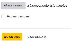 Añadir tarjeta: Por defecto al agregar el componente tipo “lista tarjeta”, solo saldrán los campos para una tarjeta, sin embargo, con esta opción es posible agregar una nueva tarjeta. El sistema permite agregar las tarjetas requeridas por el usuario.Activar carrusel: Esta opción permite activar unos botones que serán visibles en la parte inferior derecha, por fuera de las tarjetas, y permitirán pasar de forma horizontal las tarjetas agregadas con el efecto carrusel. Esto opción solo funciona para tarjetas tipo tile.Guardar: Este botón permite guardar los cambios realizados y agregar el componente en la pagina básica.